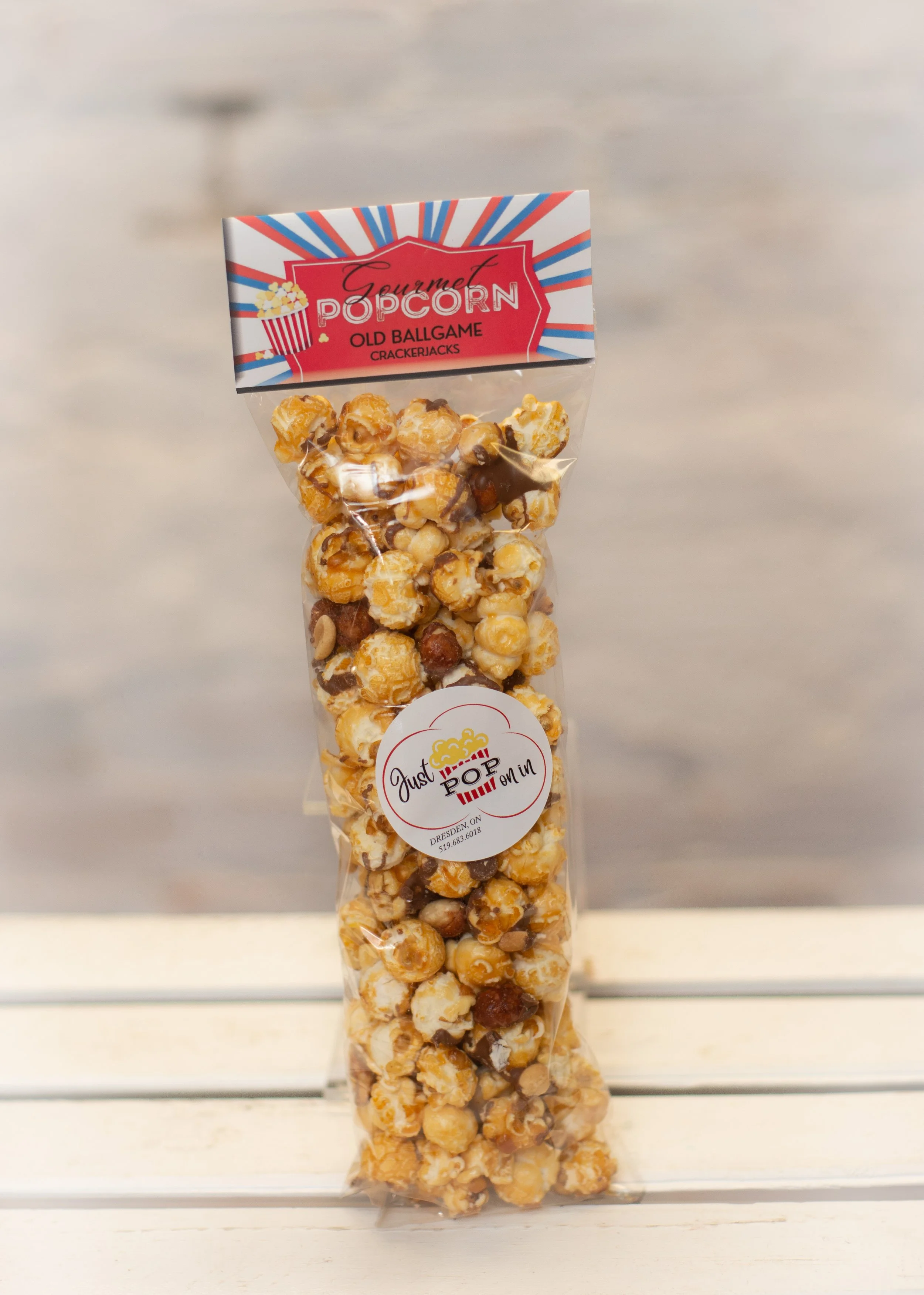 OUR DOUBLE BUTTER CARAMEL GOURMET POPCORN ; LOADS OF PRALINE CANDIED PEANUTS & SALTED ROASTED PEANUTS; ALL DRIZZLED WITH MILK CHOCOLATE